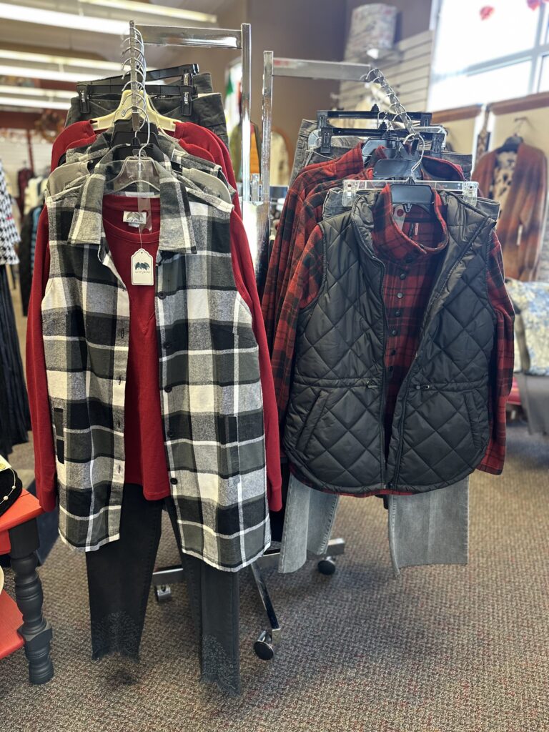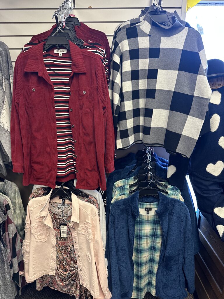 We carry sizes from newborn up to youth size 14 in children’s, and we carry a selection of petite through plus sizes for ladies.