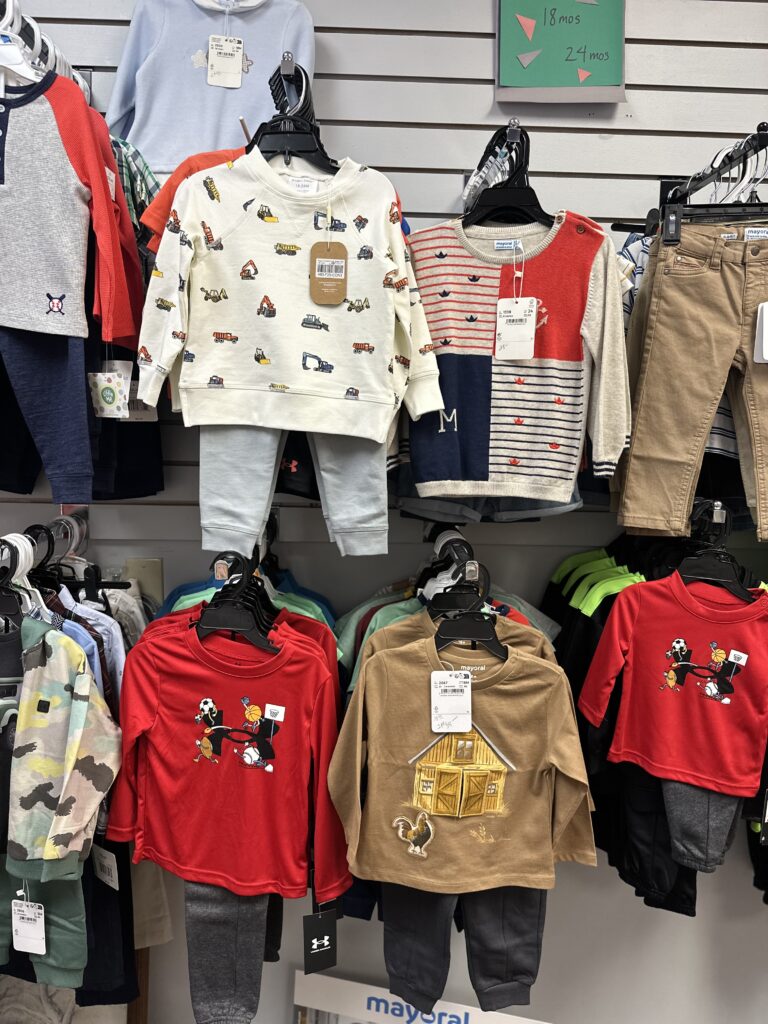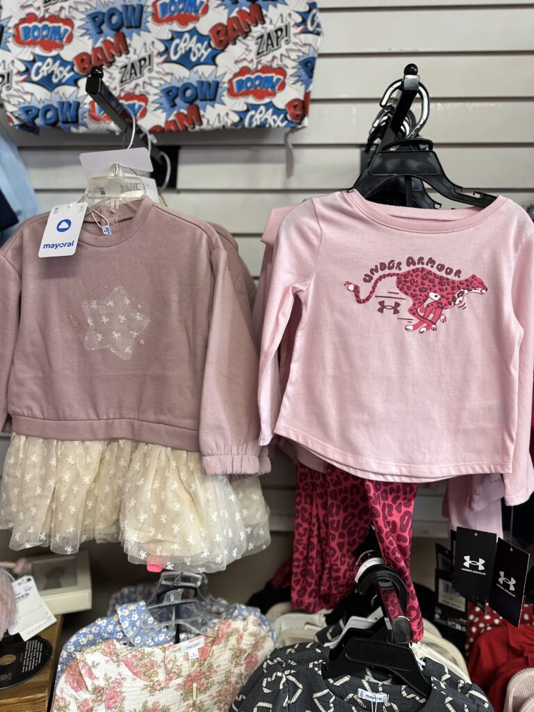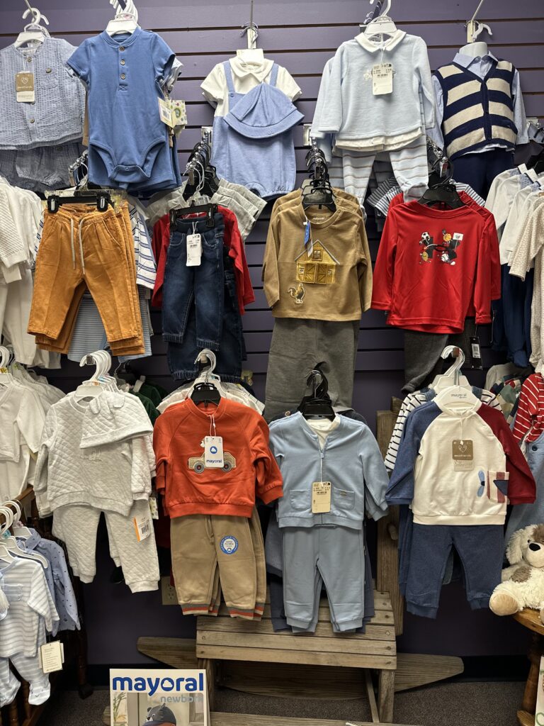 Some of the children’s brands are: Under Armour, Little Me, Copper Pearl, Isabelle & Chloe, Sophie Giraffe, Magnetic Me Sleepers, Mayoral, Mary Meyer, Keekee Pants, Noruk, and Douglas Toys.
